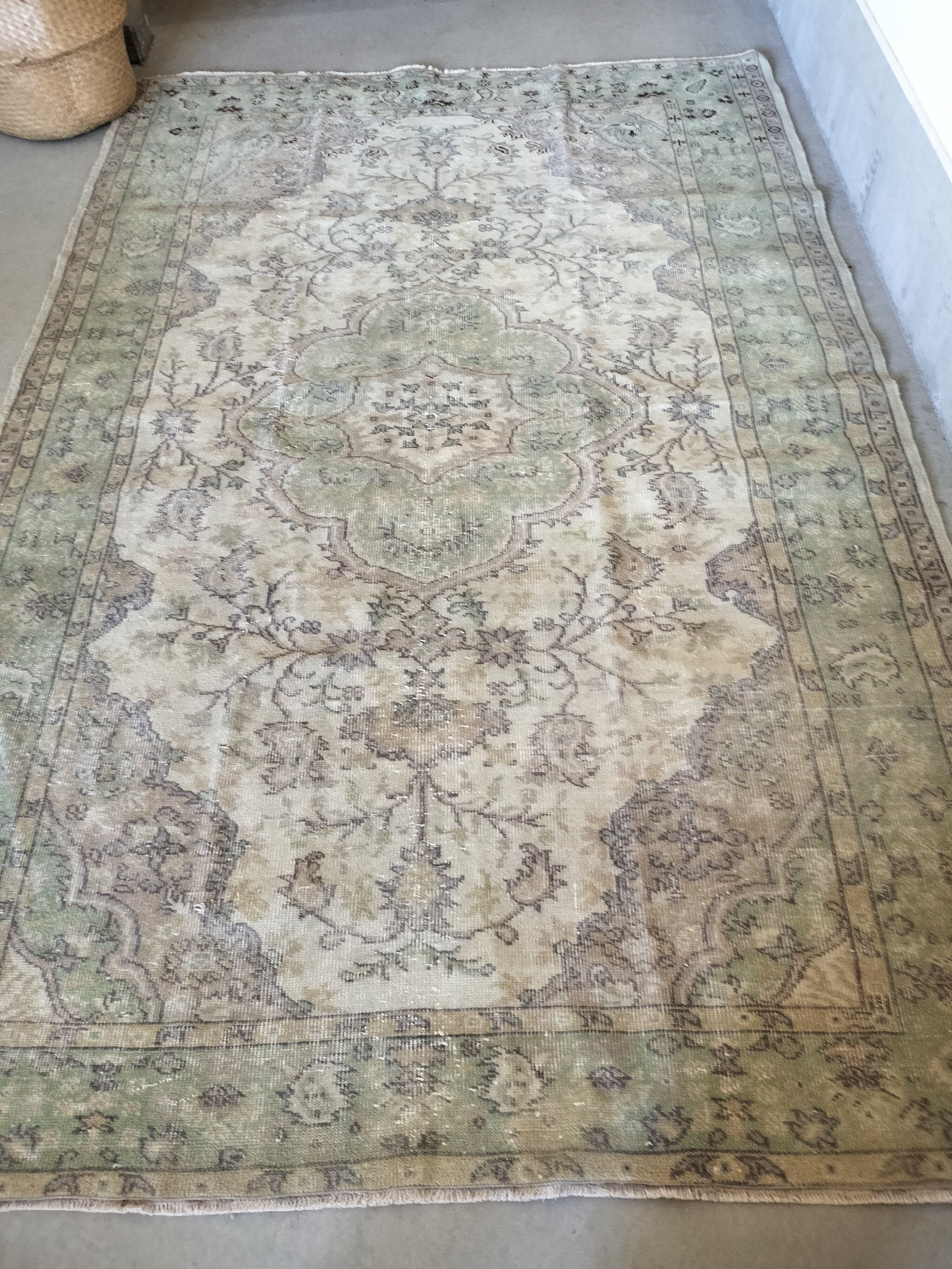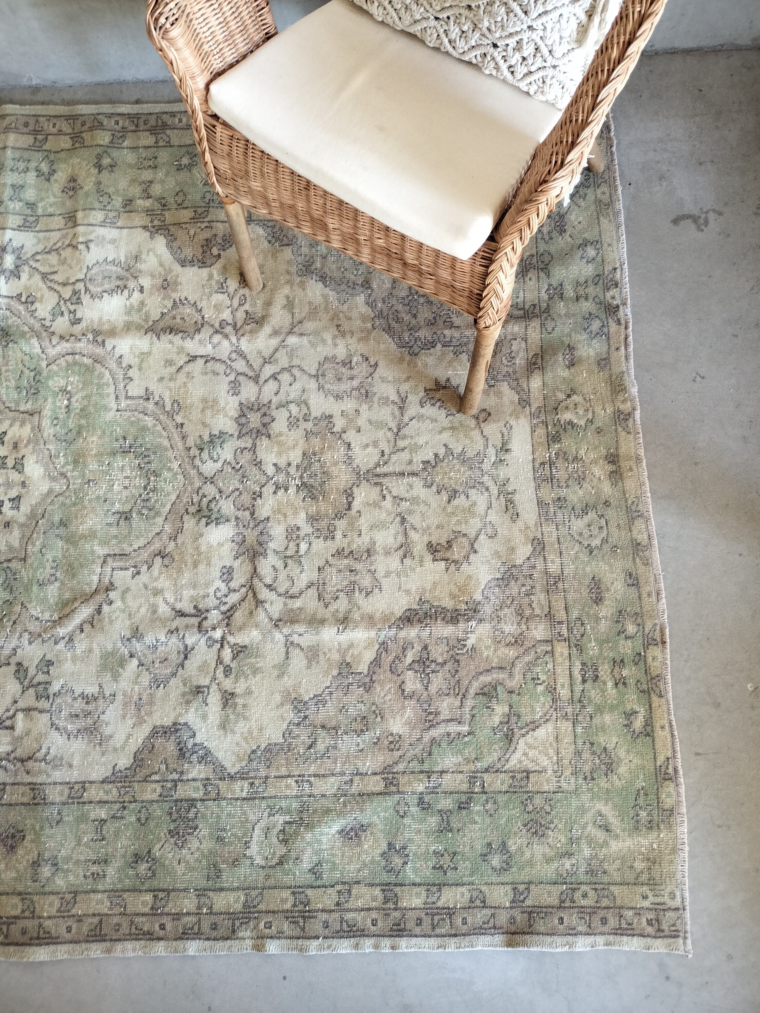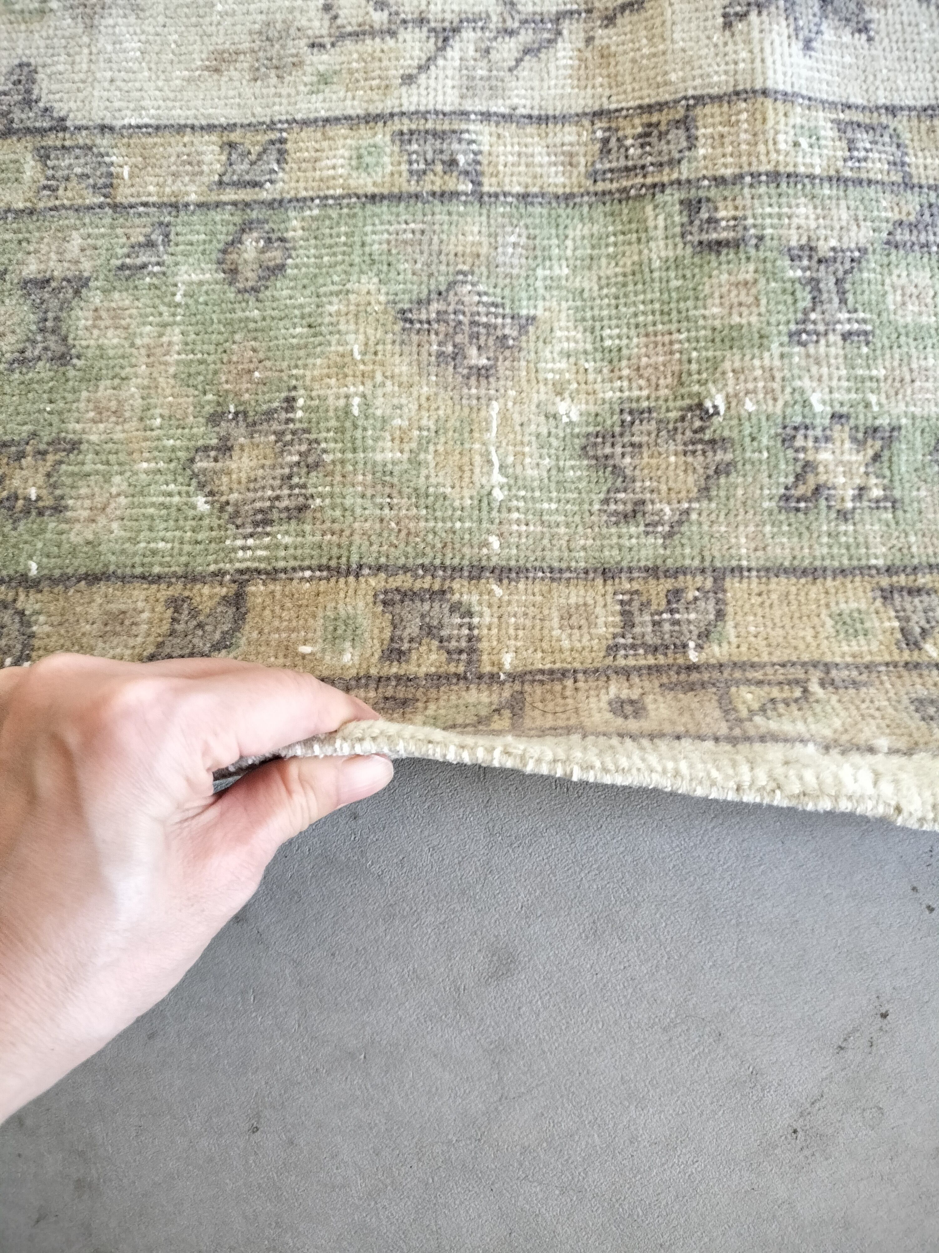 暗めベージュとくすみパステルグリーンの落ち着いた色味のヴィンテージトルコラグ。高級感のある繊細な柄と色合いが素敵です。