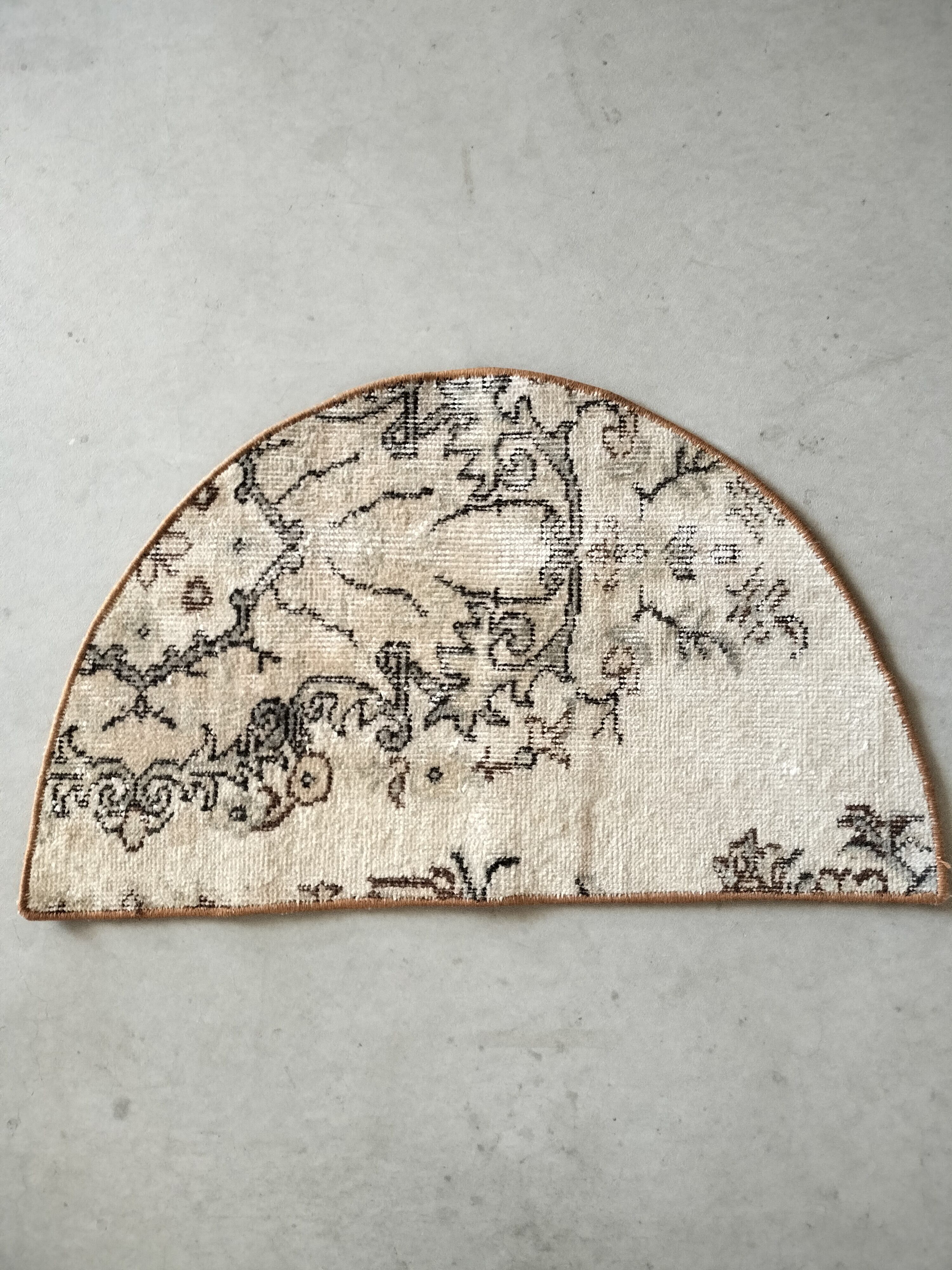 ベージュに黒のライングレーとブラウンで柄が入るシックな色味の半円ラグ。縁どりの糸はマスタードイエローです。