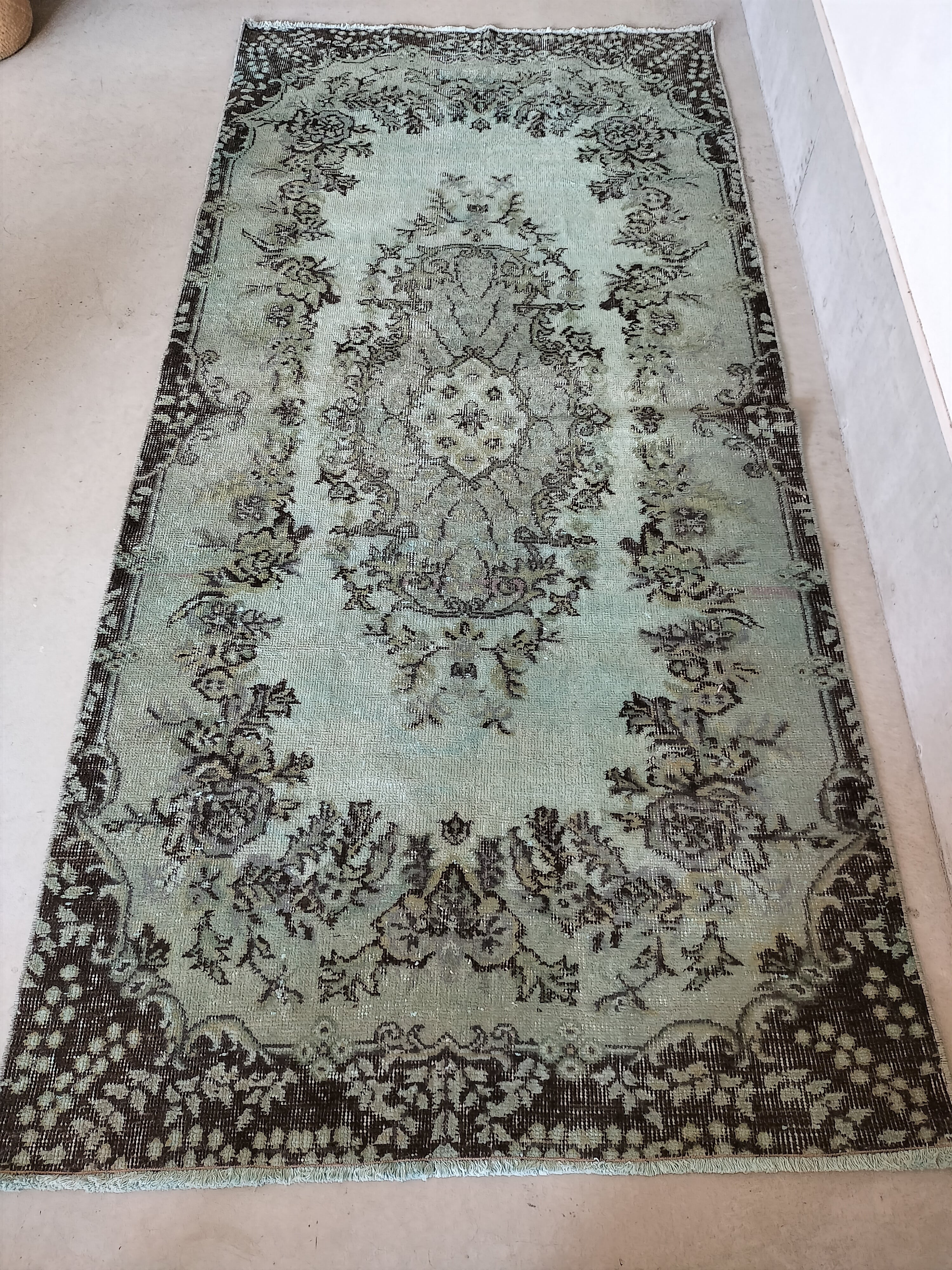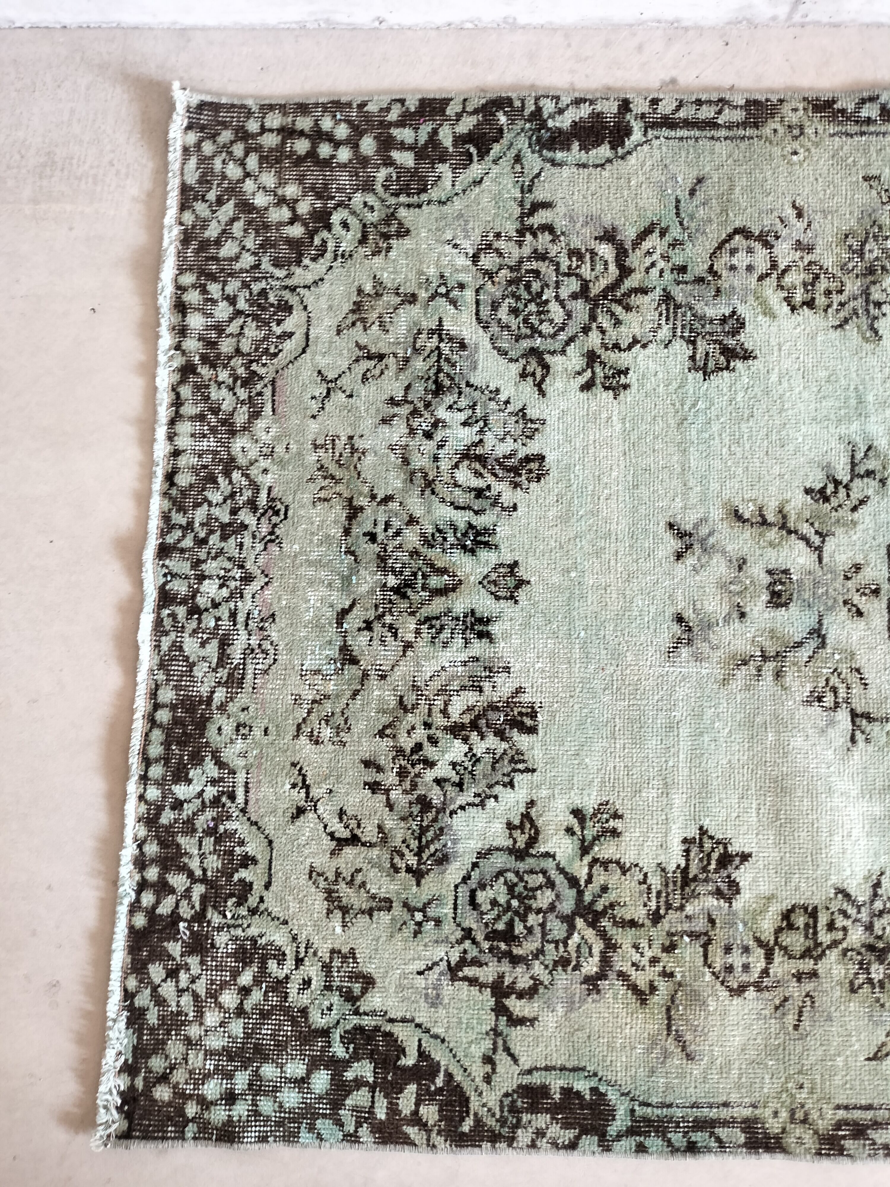 くすみグリーンでオーバーダイされた定番柄のラグ。