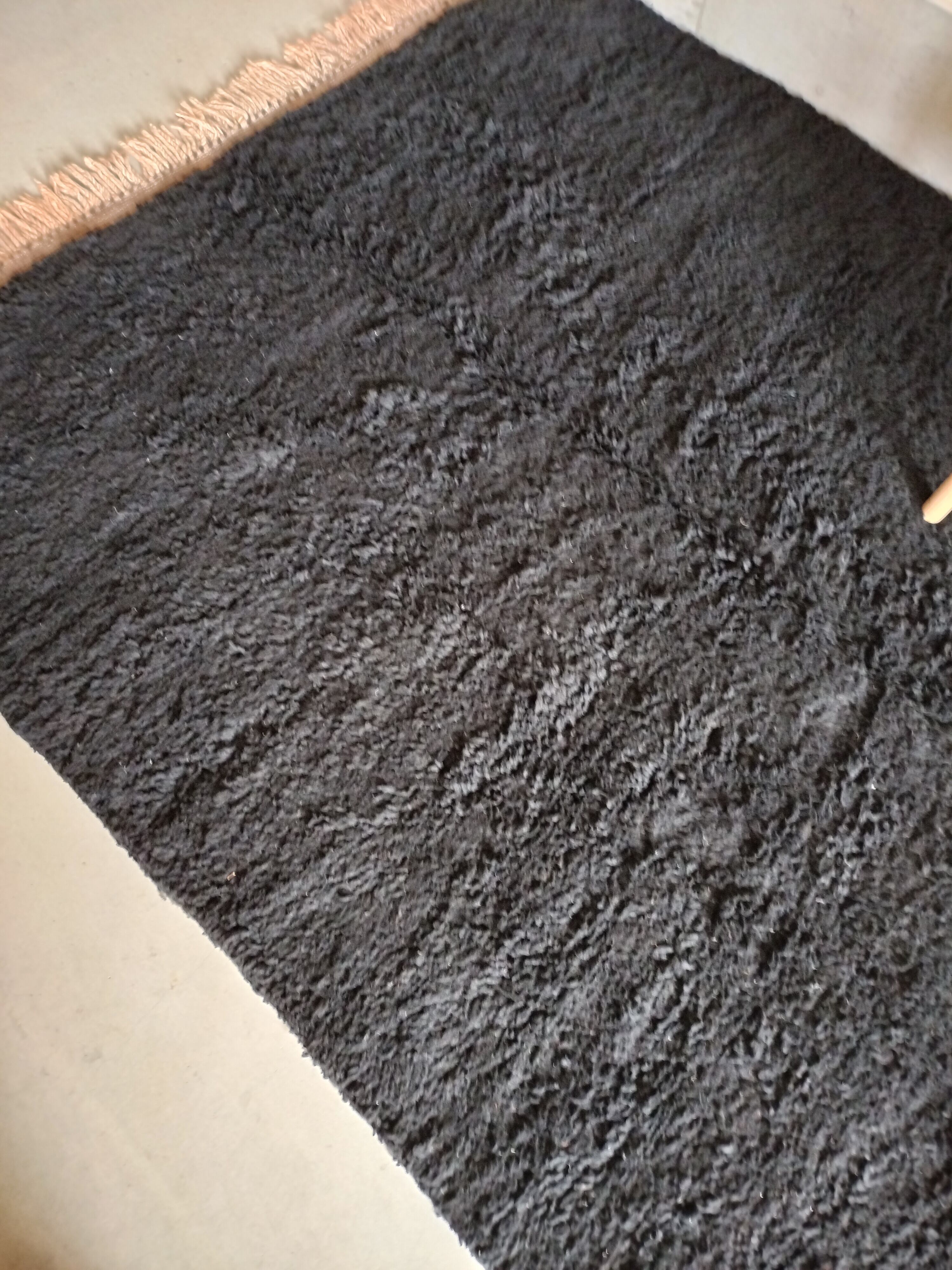 数の少ない、ブラックのベニワレンラグ。単色のラグですが端の処理に丁寧なステッチと縞模様が入り職人さんの技を感じます。