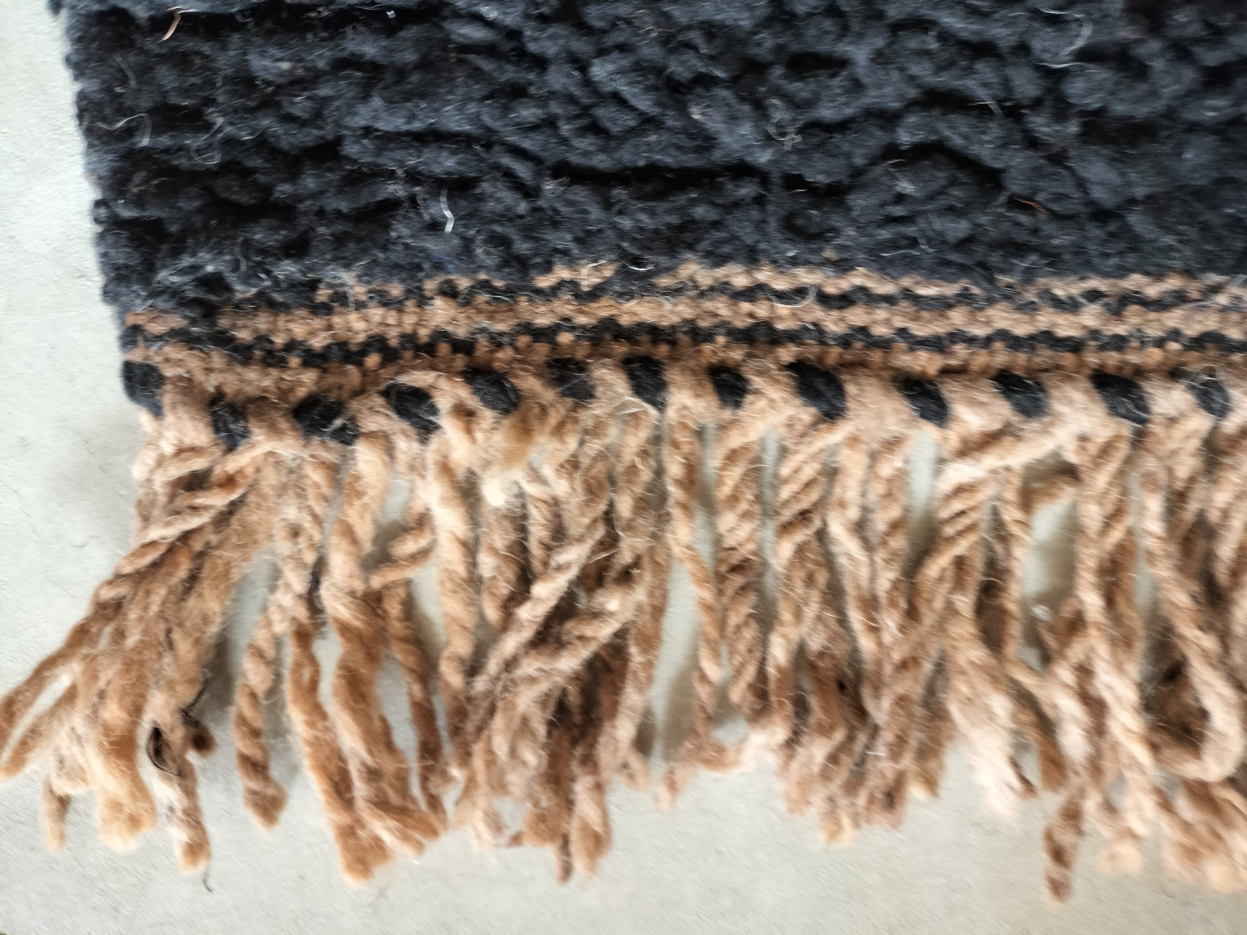 艶のあるブラック1色て織られています。お写真では光の加減で少し白っぽく写ってしまいますが、実物は黒一色です。フリンジは渋いブラウン。
