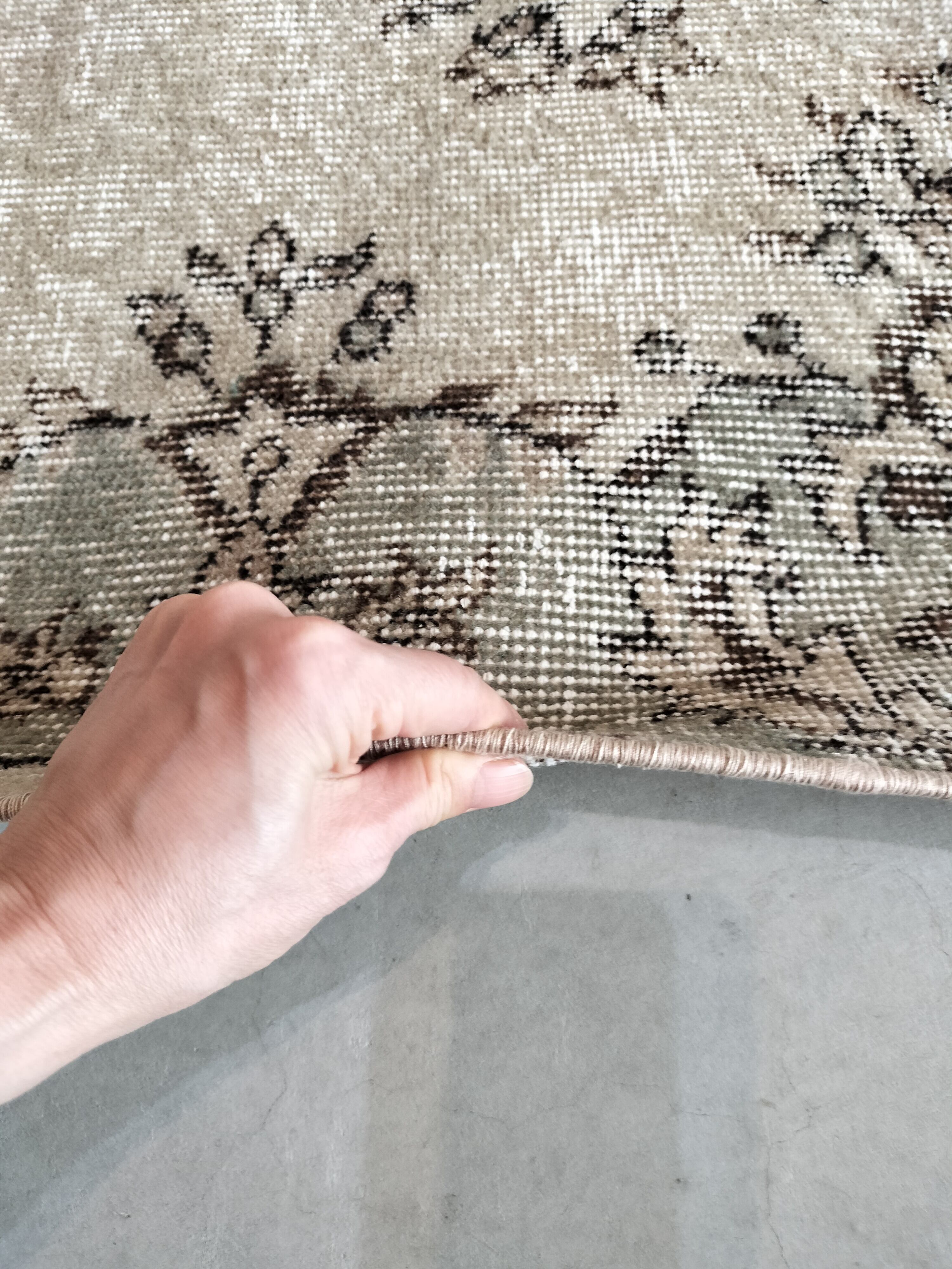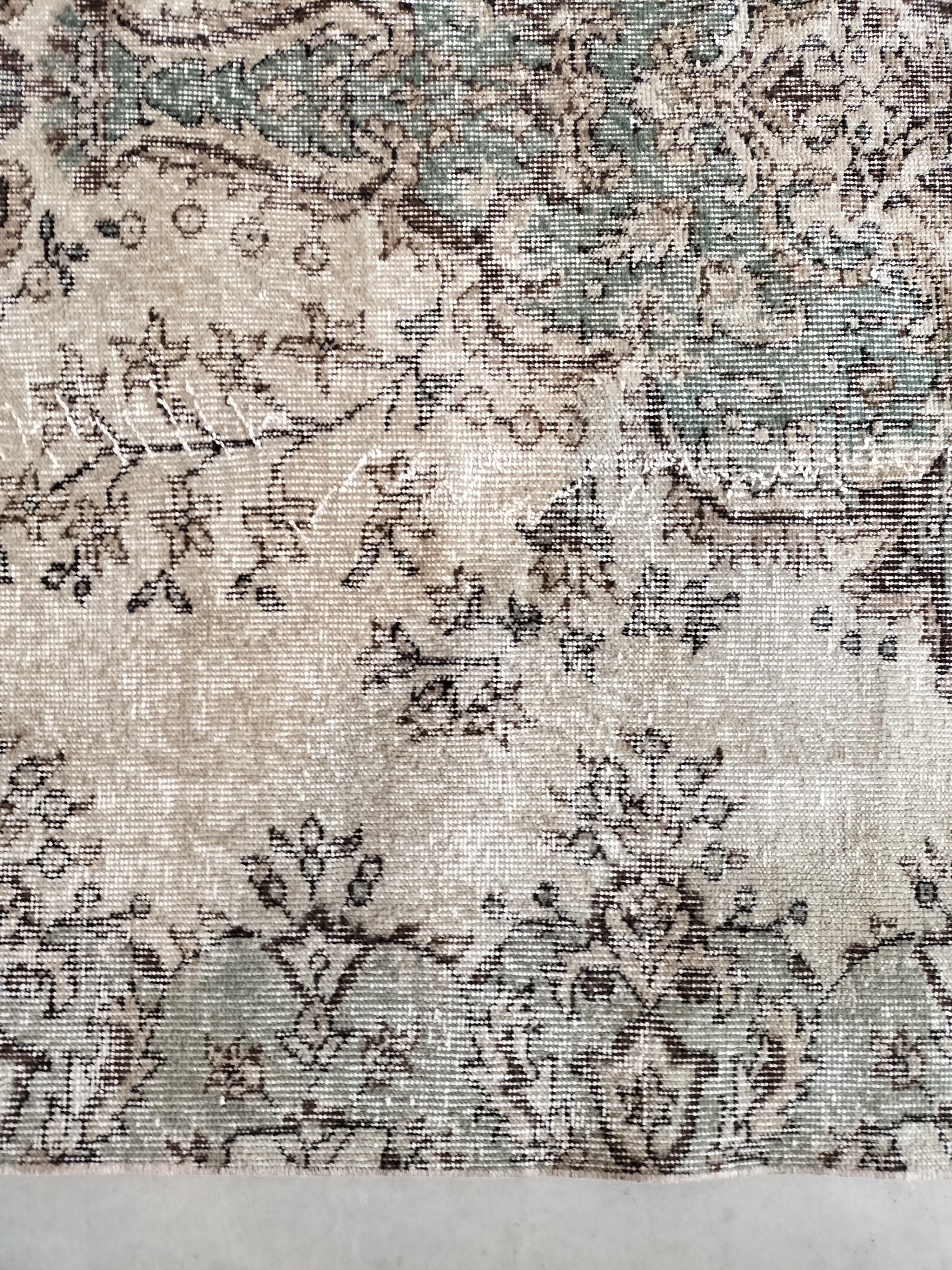 暗めの落ち着いたベージュをベースにくすみの入ったグリーンで模様の入るメダリオンラグ。全体の落ち着いたヴィンテージらしい暗めの色味にグリーンがほんのり色味を添えています。
