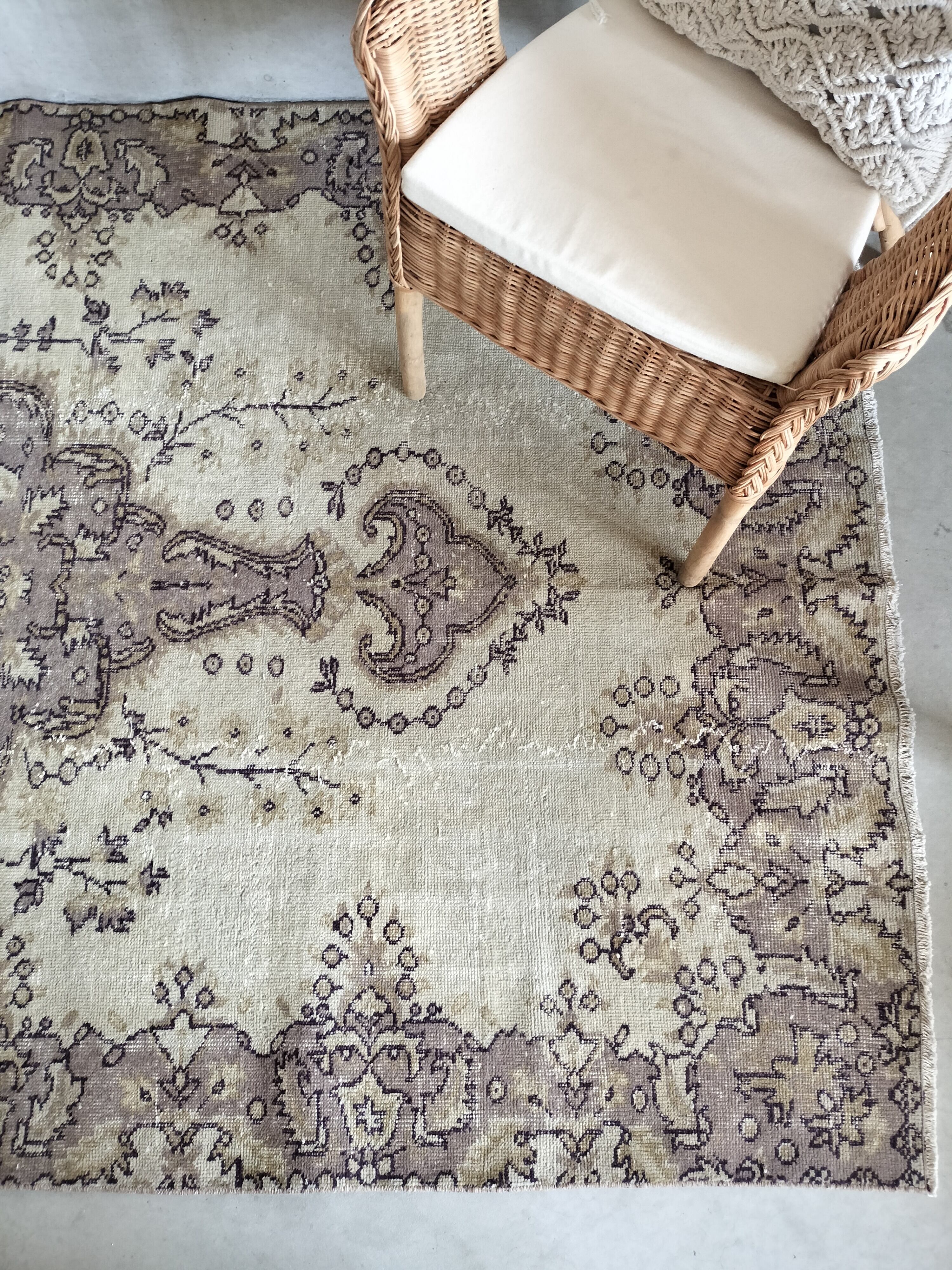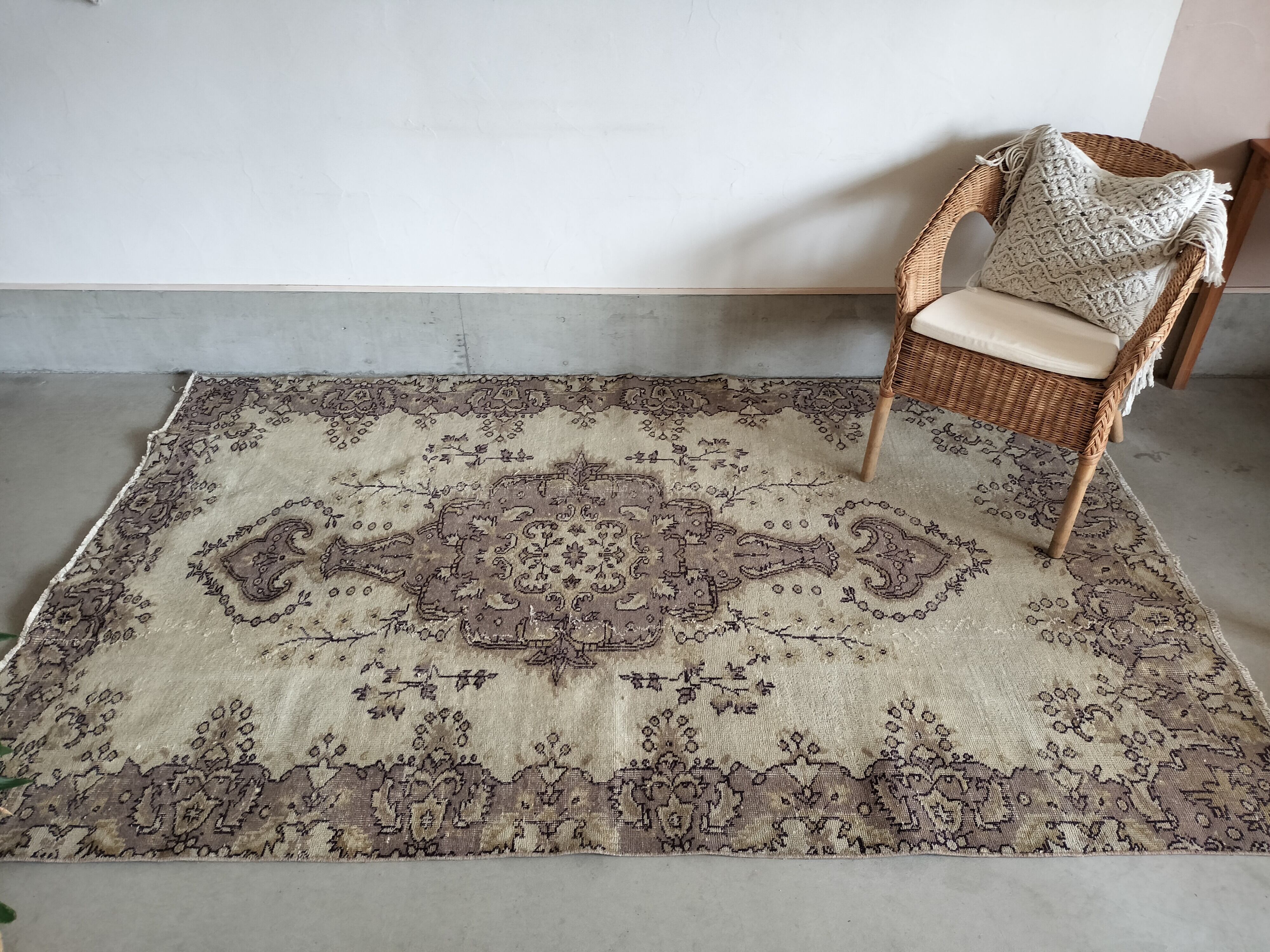 暗めの落ち着いたクリームベージュをベースにグレージュで模様の入るメダリオンラグ。ダークブラウンでラインが入ります。全体的に落ち着いたヴィンテージらしい暗めの色あいで色味が少なくインテリアに合わせやすそうです。