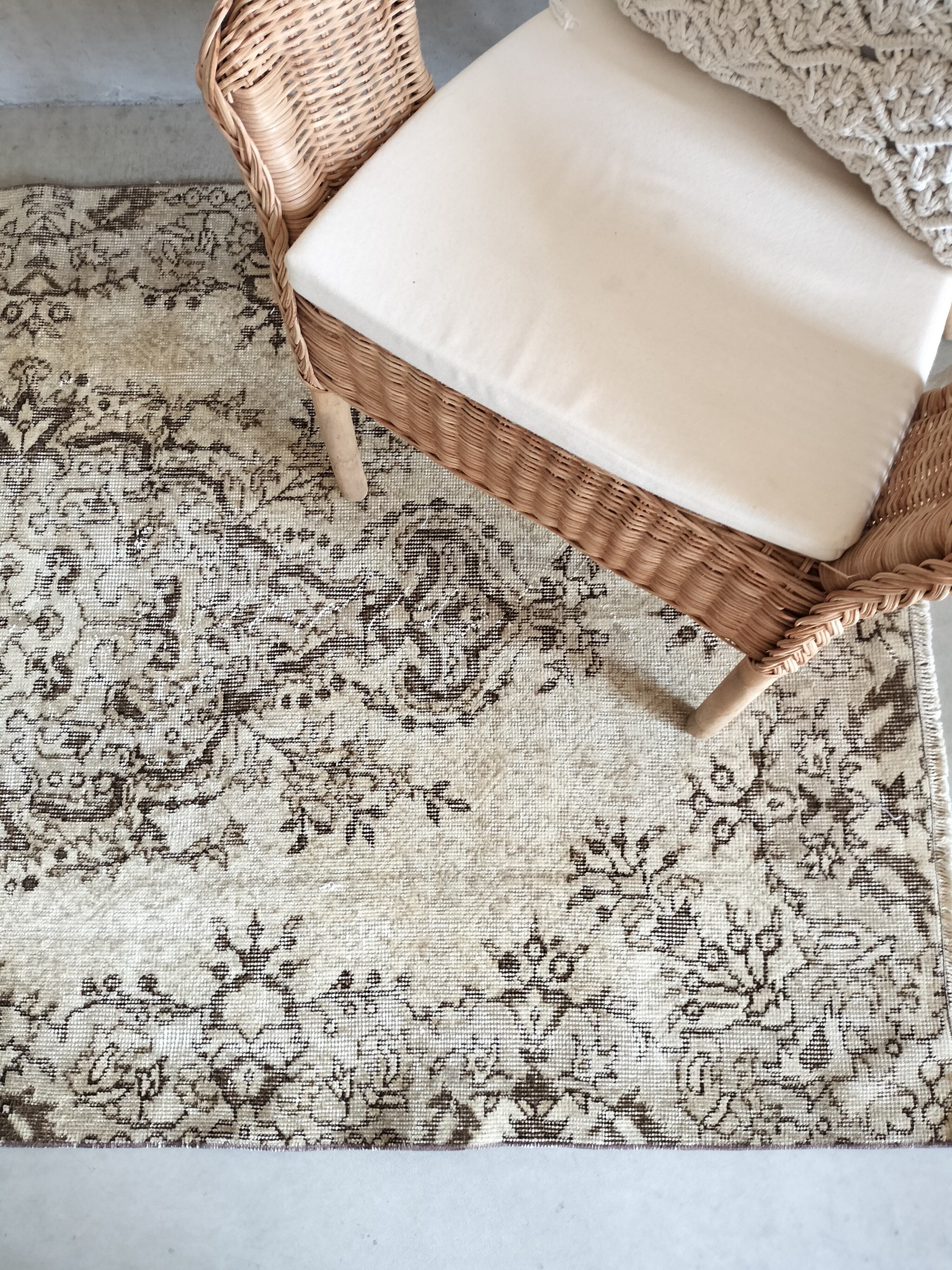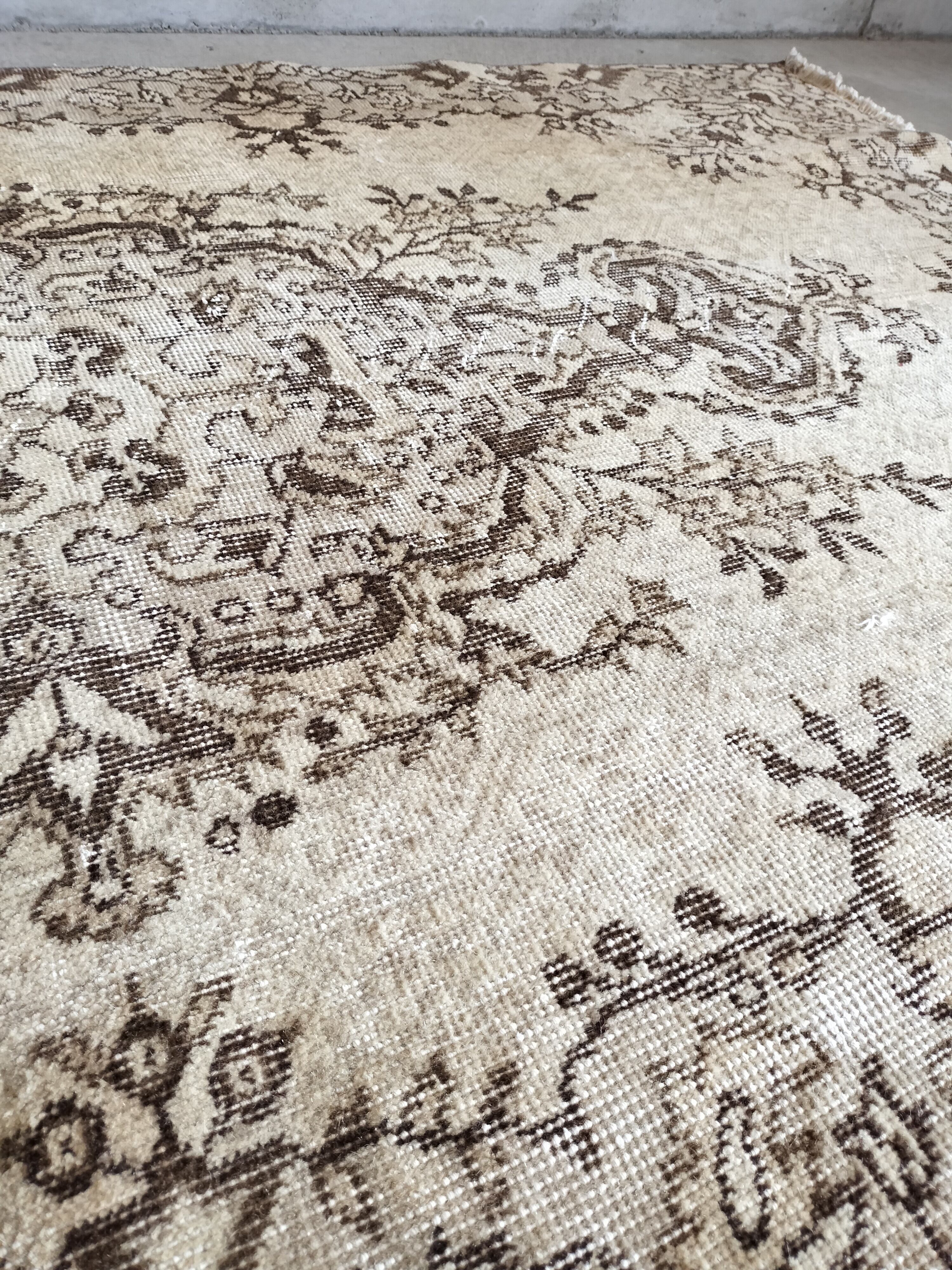 クリーム色をベースにカフェオレカラーやブラウンが入る色数が抑えられたシックなトルコラグ。ベースのクリームカラーの部分にも淡いカフェオレで繊細な模様が入り、織り手の丁寧な仕事を楽しんでいただける1枚です。