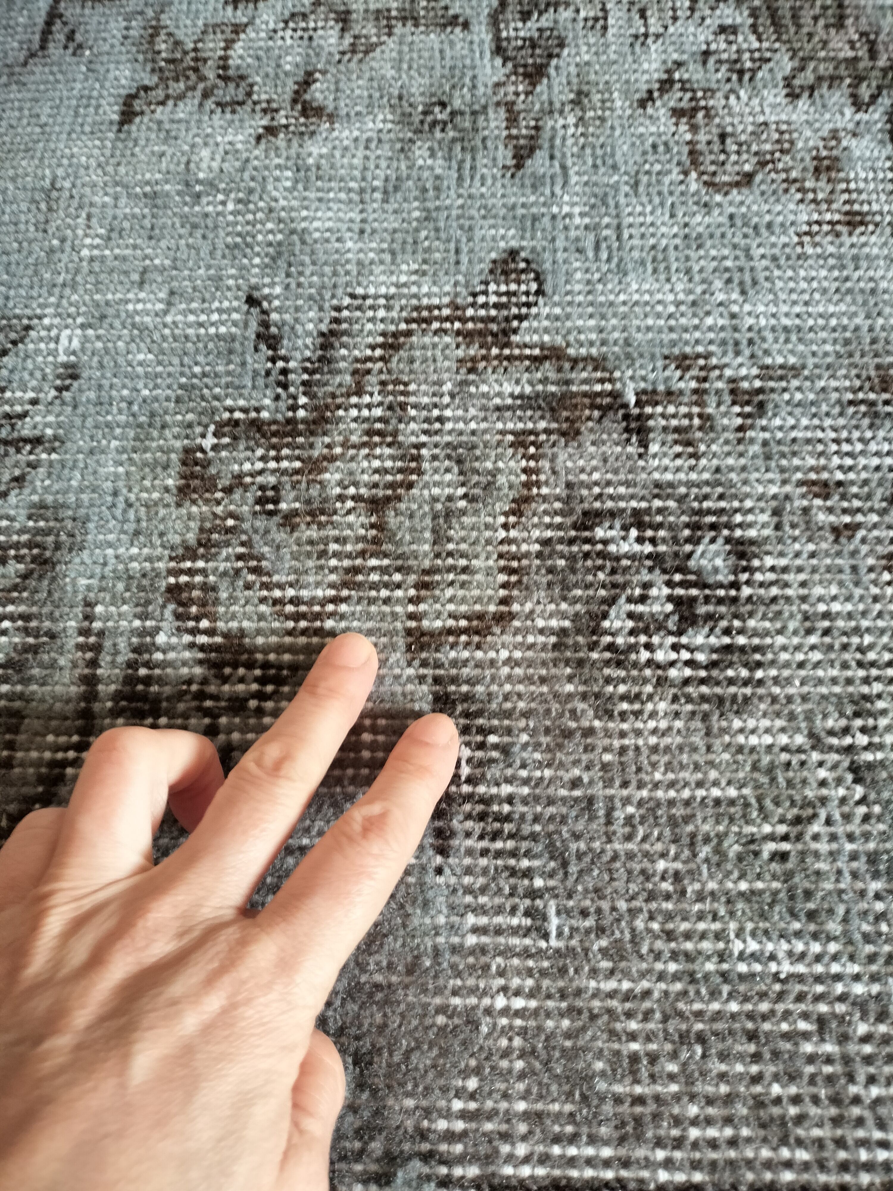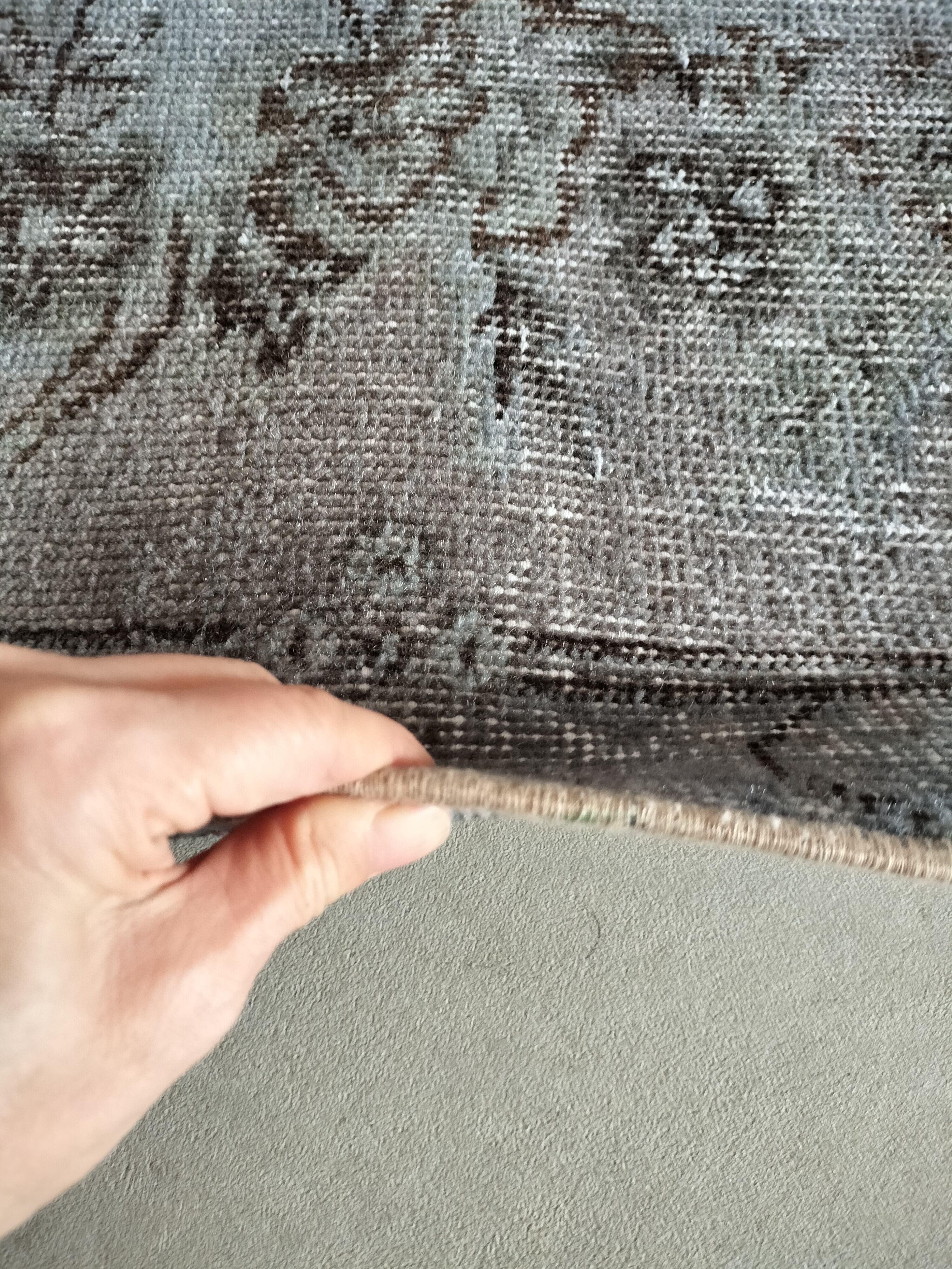 ネイビーがかった美しいグレーでオーバーダイされた人気色のヴィンテージトルコラグ。