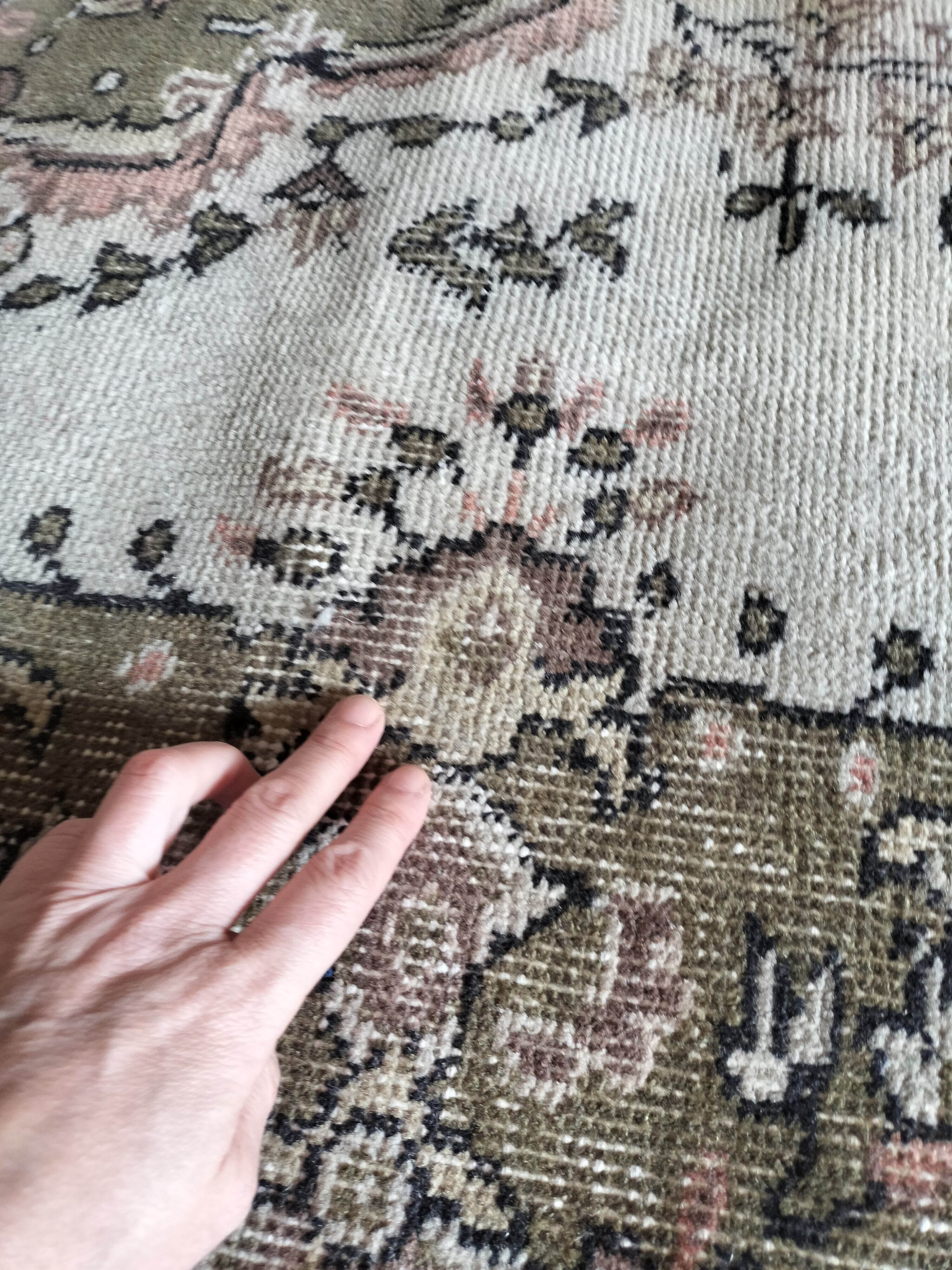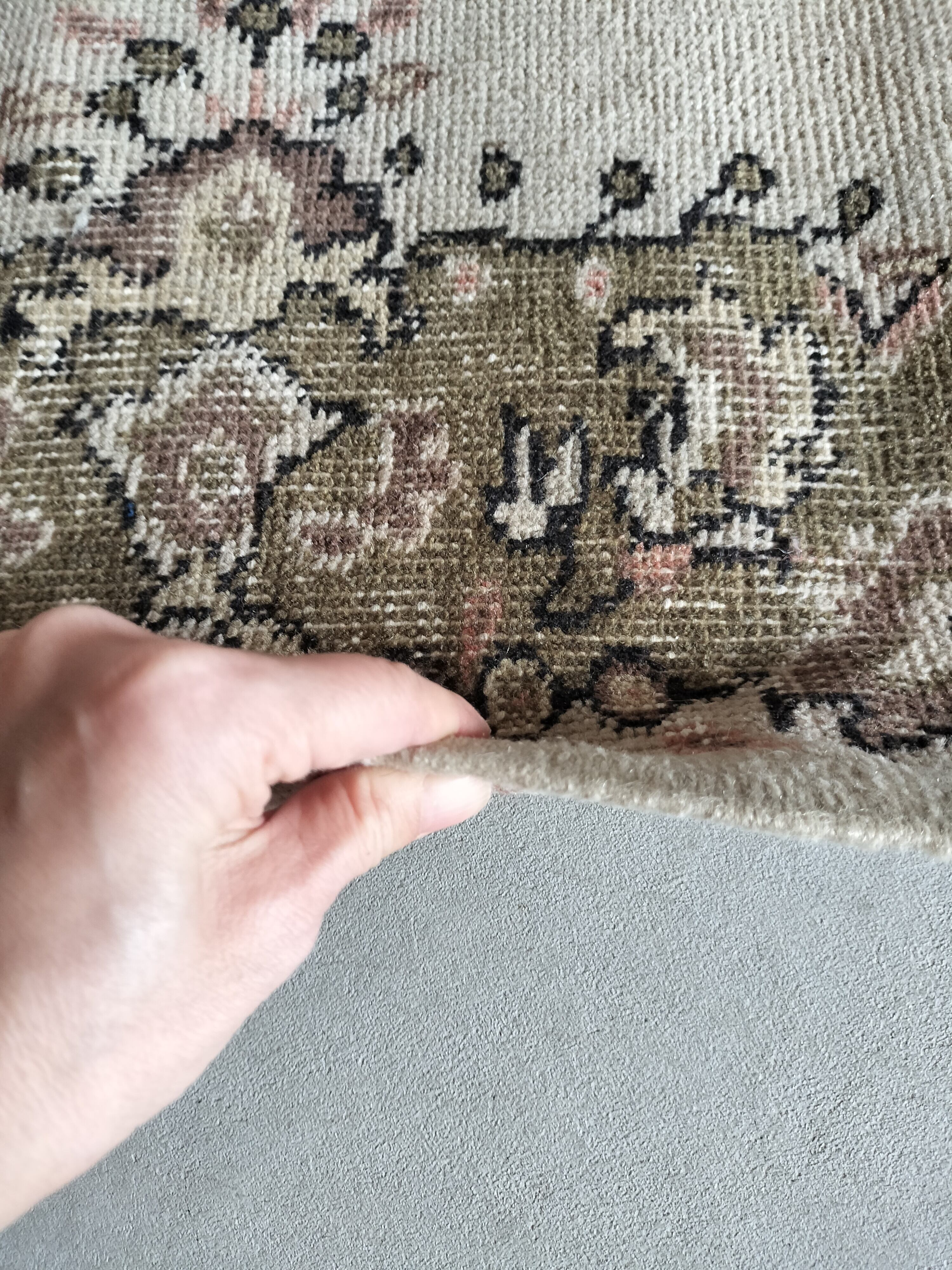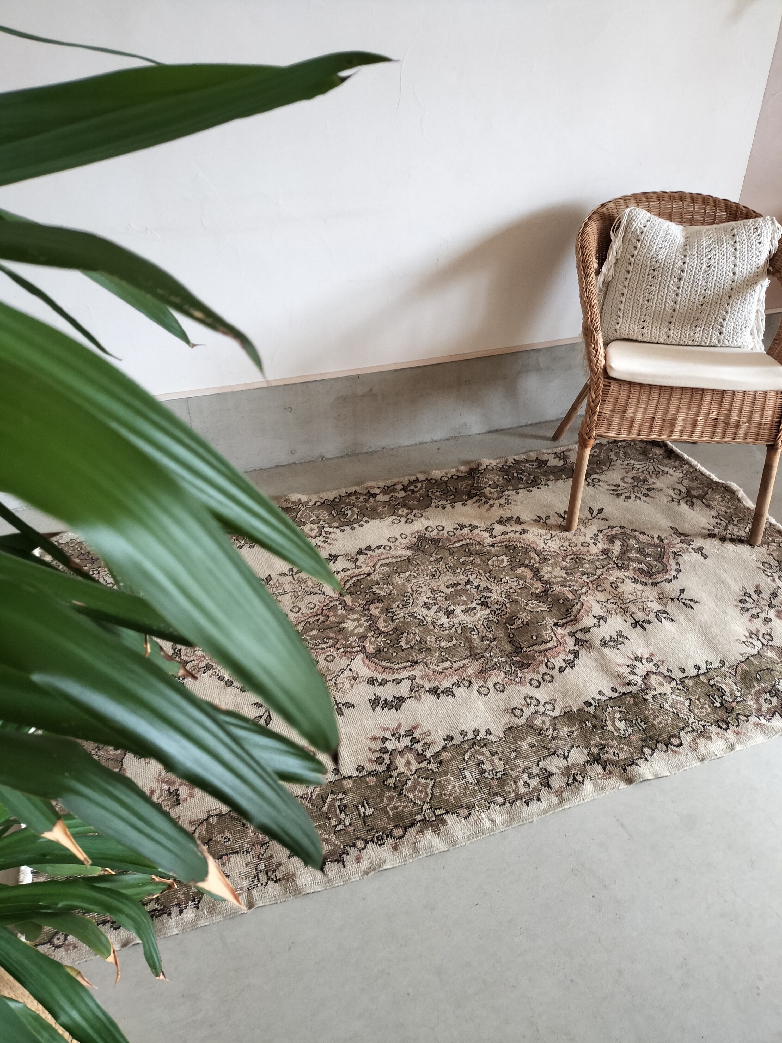 ベージュをベースに暗めのモスグリーンで柄が入るヴィンテージラグらしい色合いのトルコラグ。モスグリーンの中にはサーモンピンクやブラウンが入り、ラグに温かみを添えています。