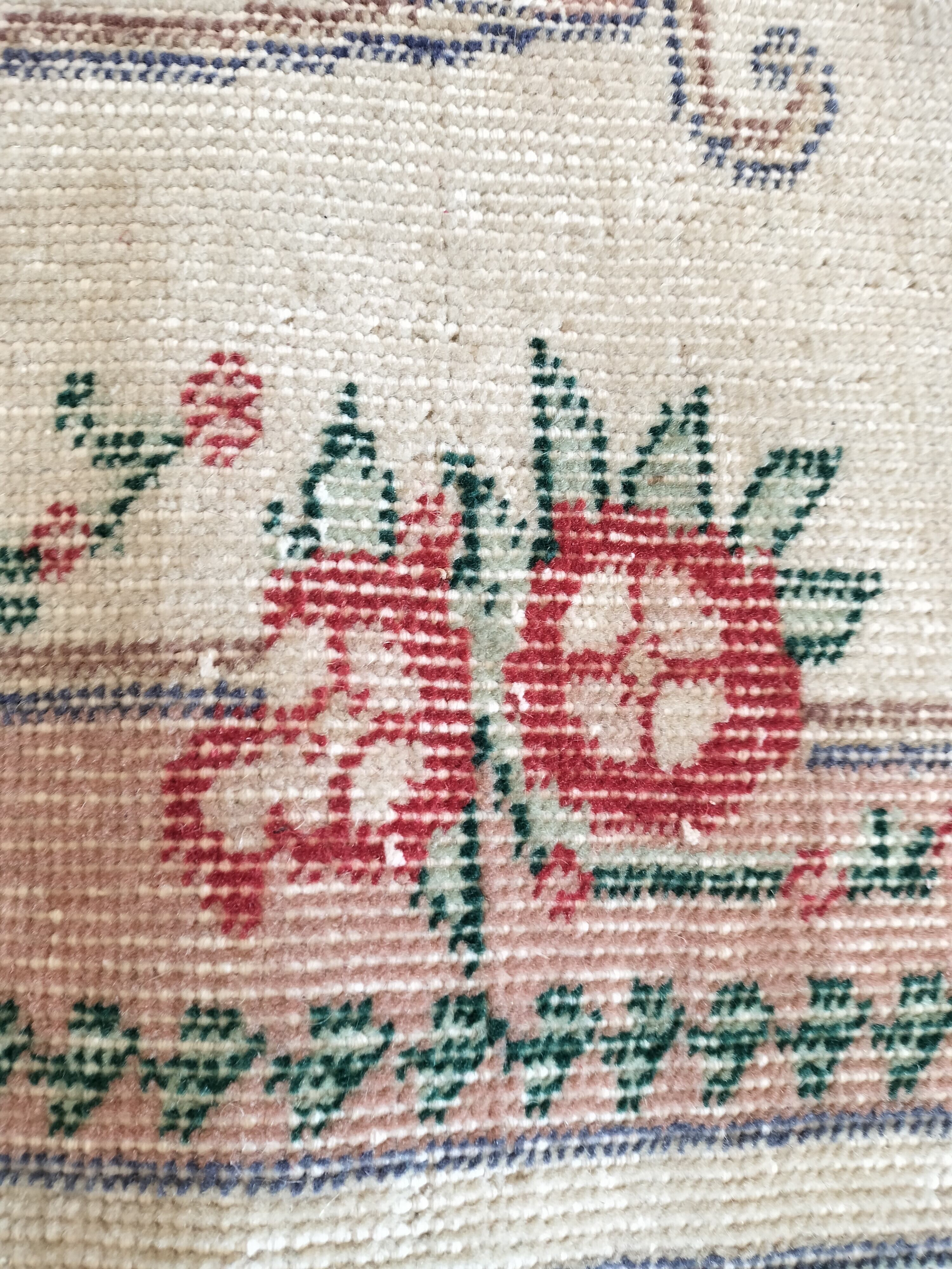 落ち着いたベージュをベースにレッドやグリーン、くすみピンクの入る上品なラグ。優雅なお花の咲くガーデンのような柄です。