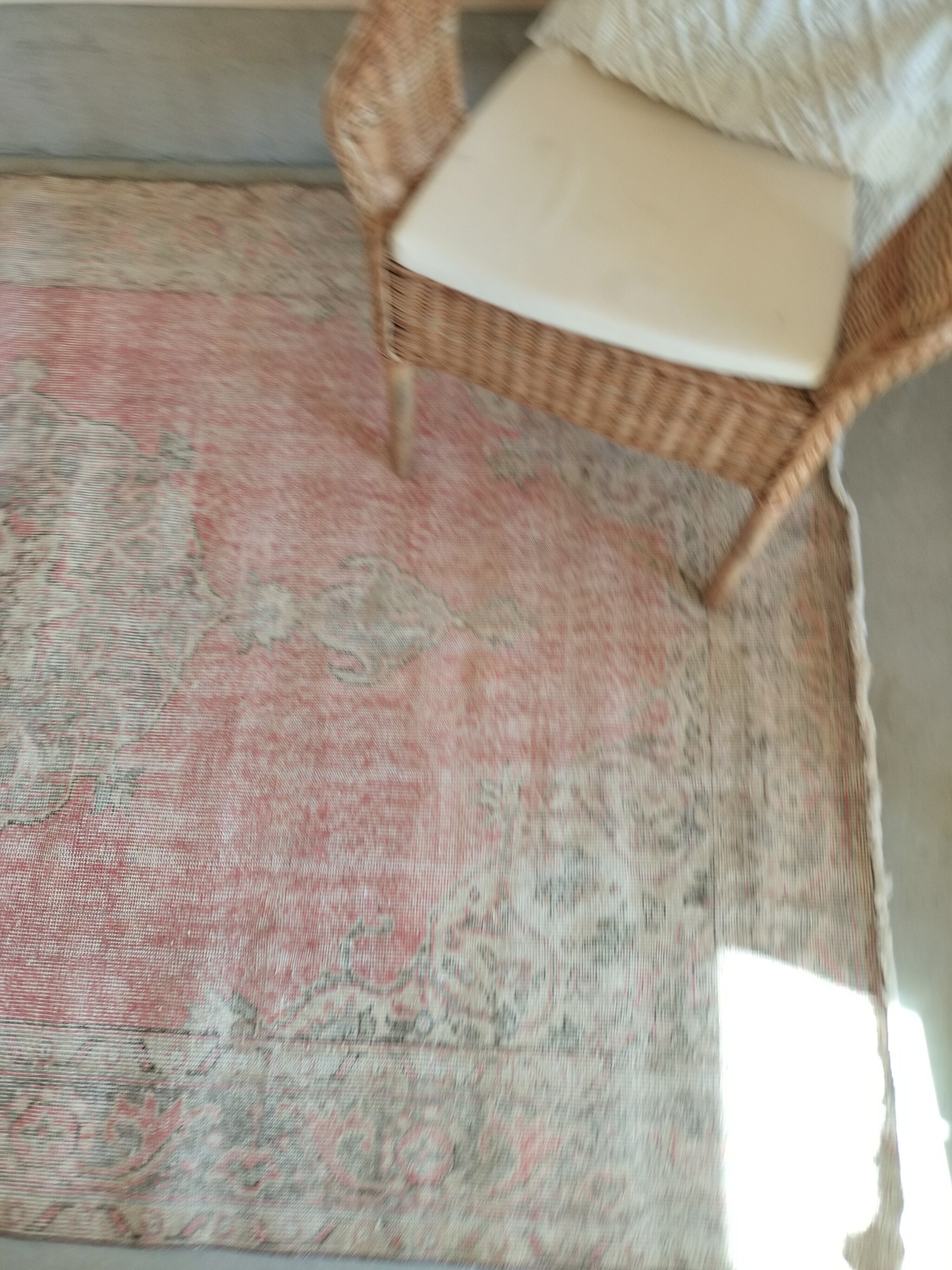 パステルローズピンクにベージュやペールグレーで柄の入る全体的に淡い色合いの美しいラグ。