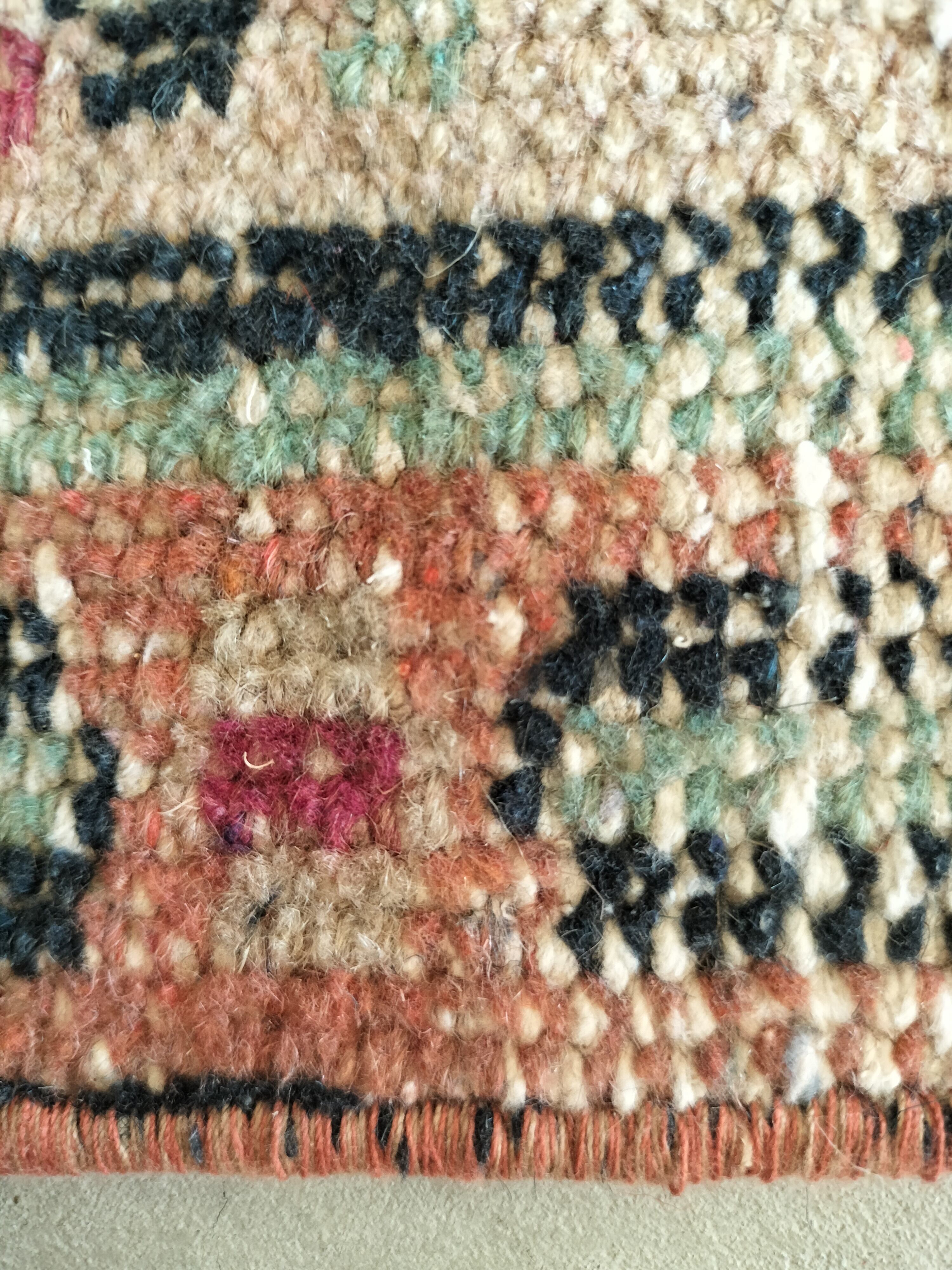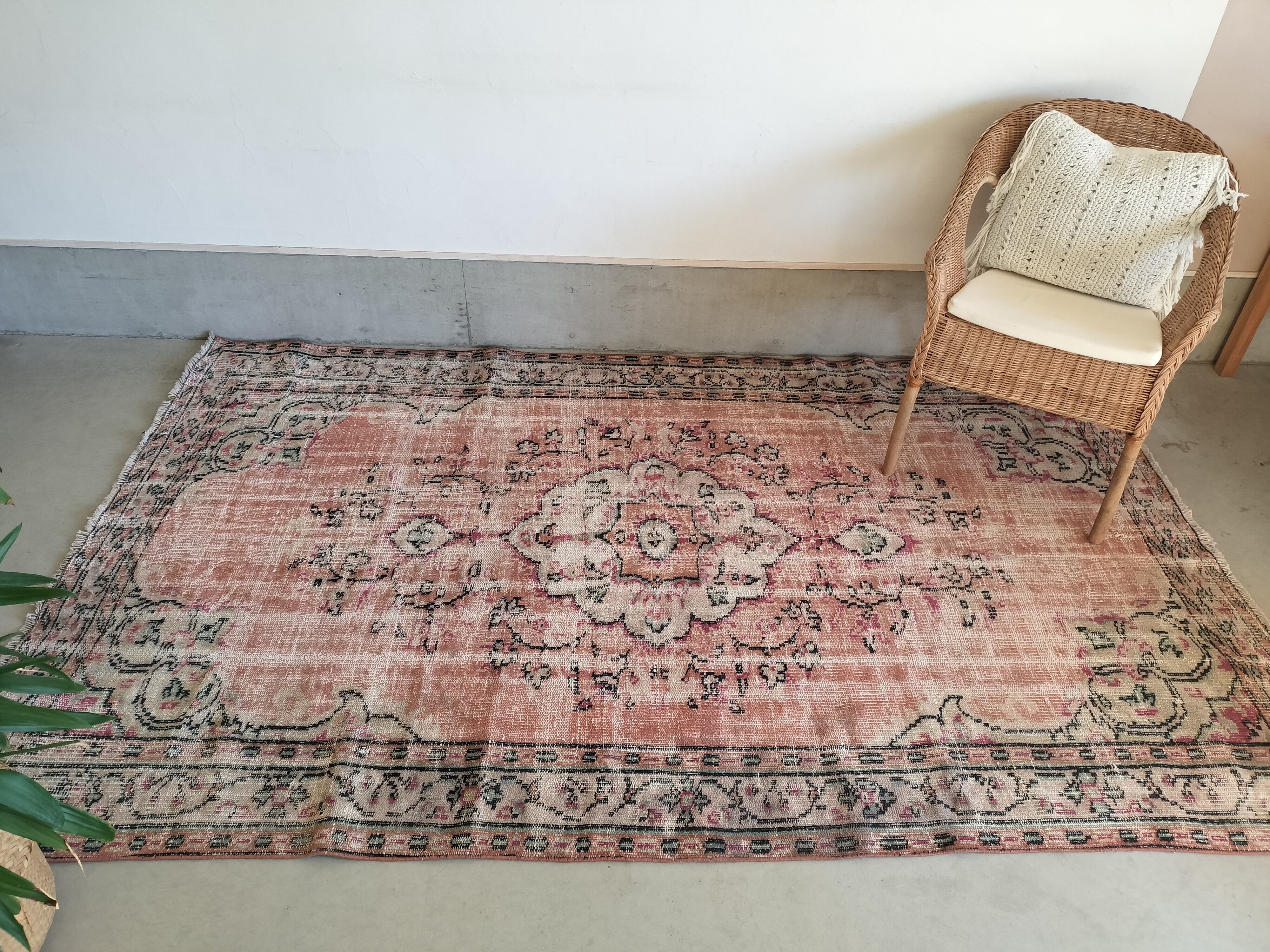 かすれの入ったシャビーなオレンジをベースに黒や淡いくすみグリーン、バーガンディでメダリオン柄の入るトルコラグ。