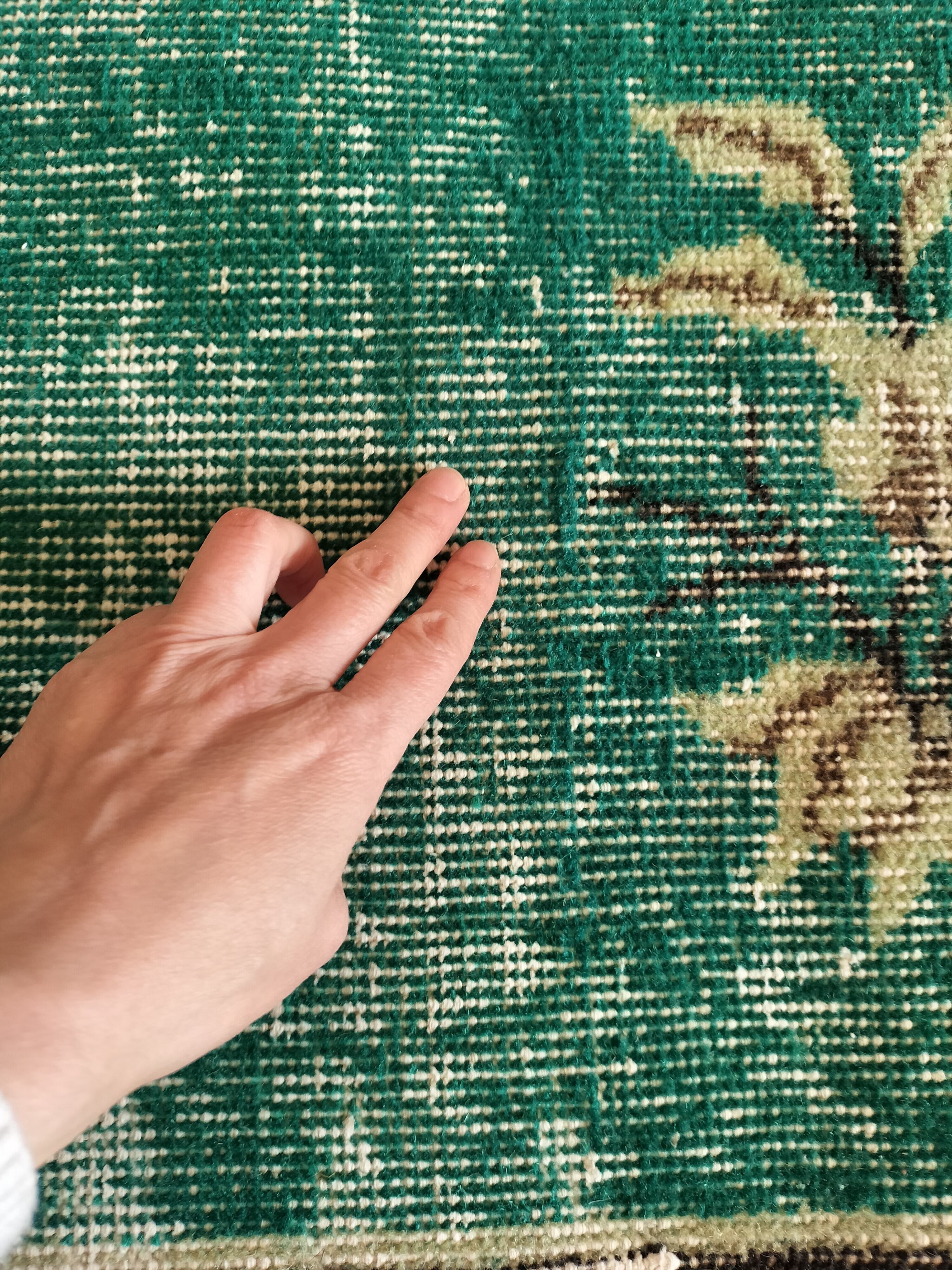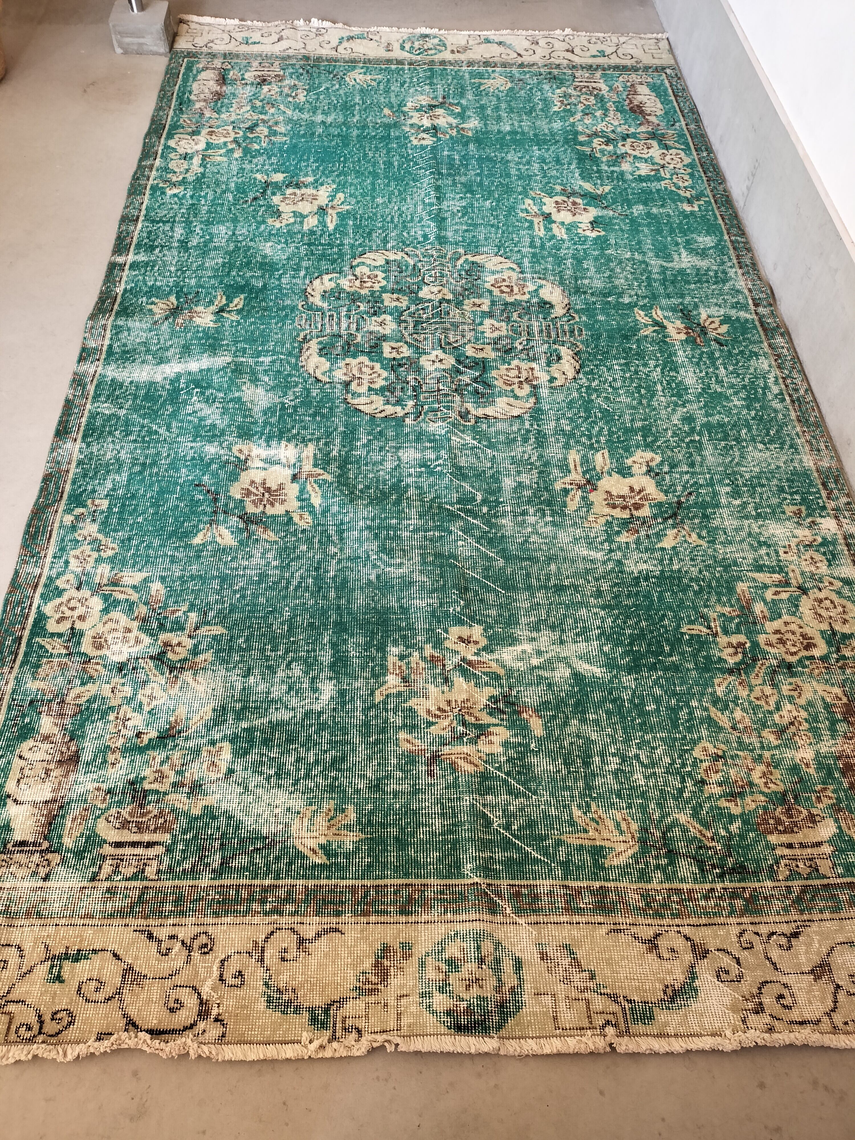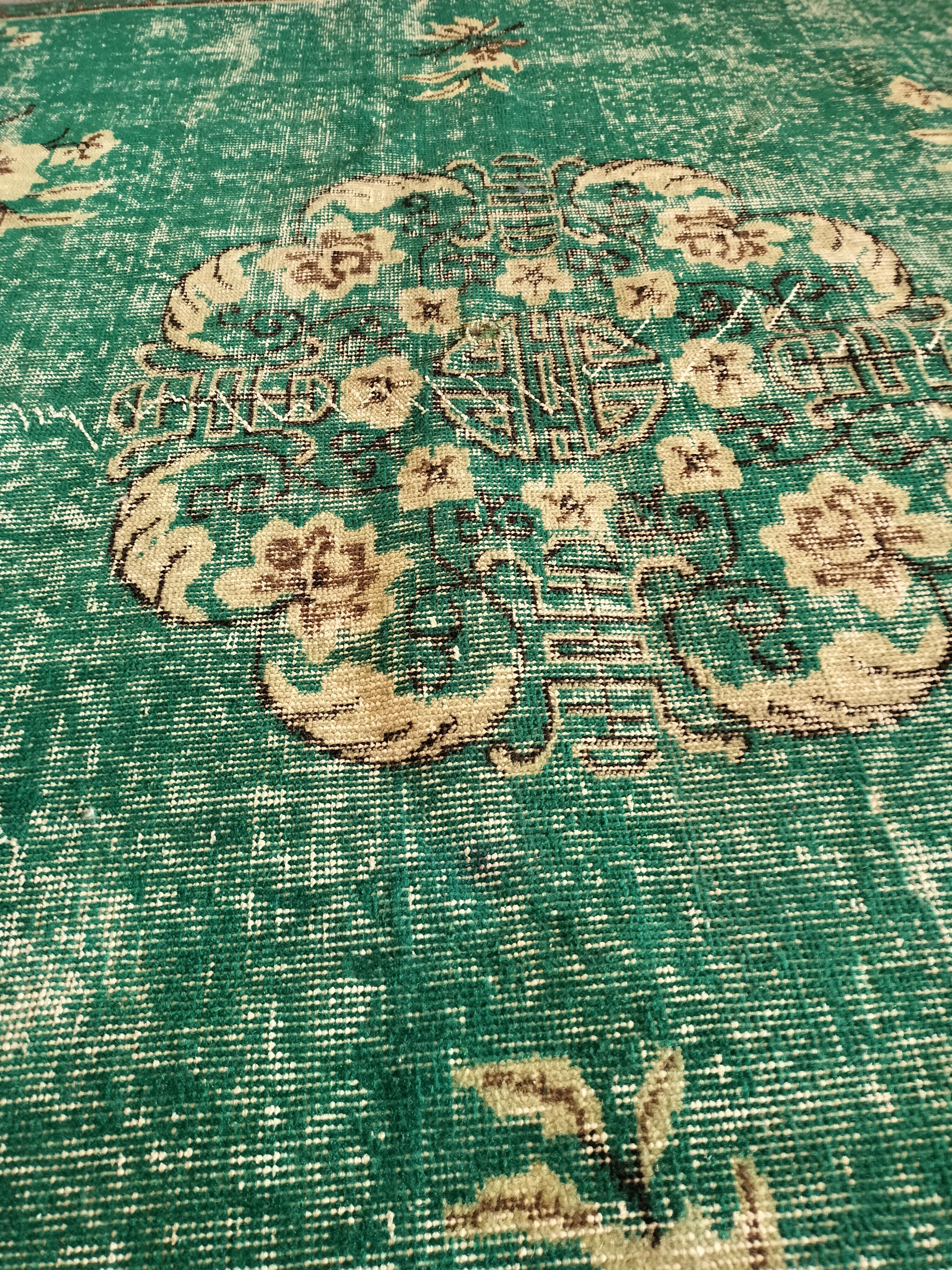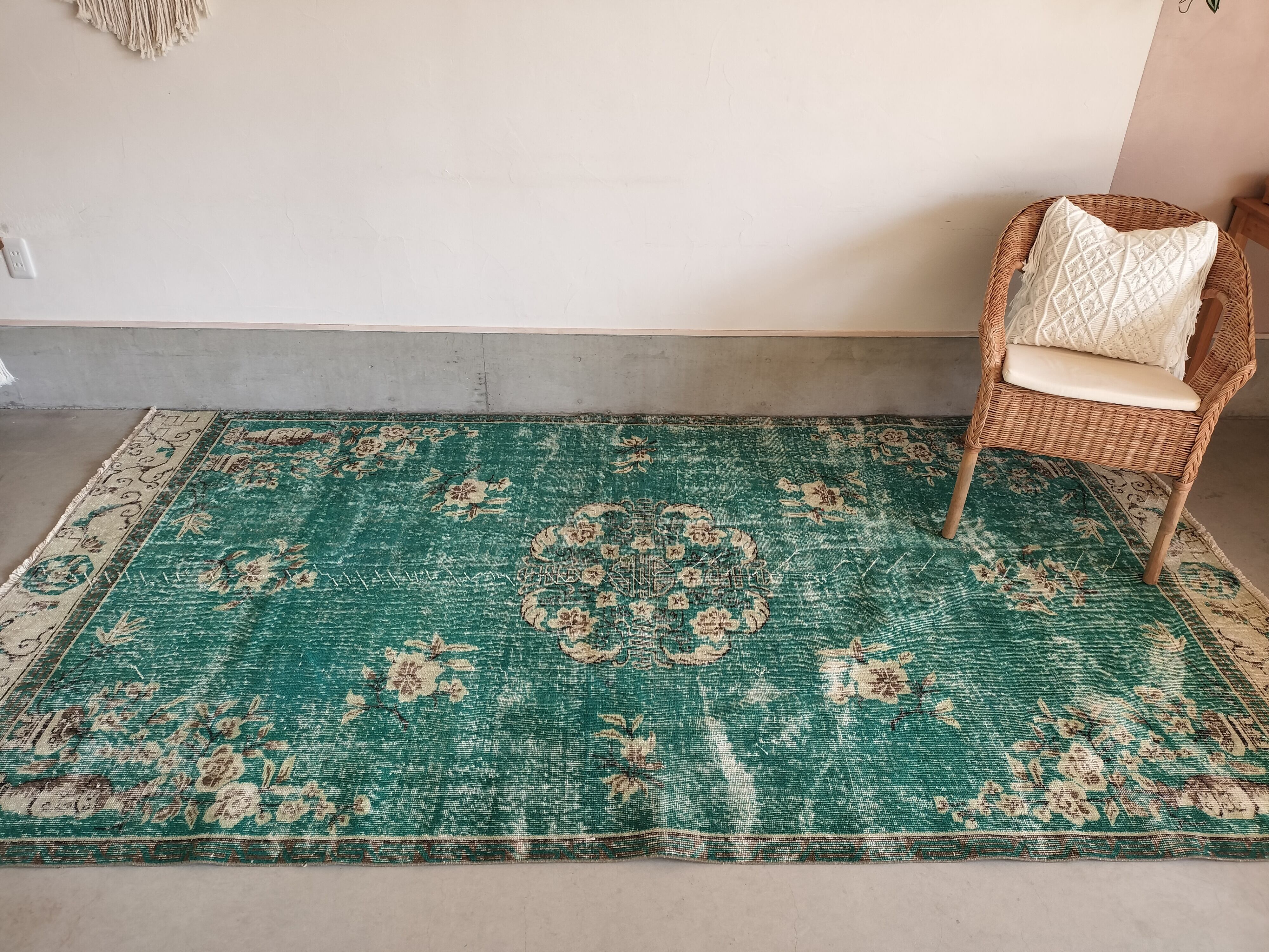 深いエメラルドグリーンが美しいヴィンテージラグ。深い湖のような色合い、シノワズリ調の柄が上品な一枚です。